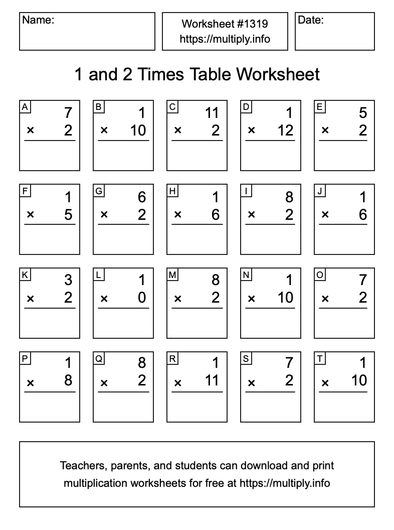 Here is the 1 and 2 Times Table Worksheet #1319. This worksheet contains problems related to the multiplication table of 1 and the multiplication table of 2. Print and/or save the worksheet using the buttons below the image. You can also drag or right-click on the image to download it to your device.