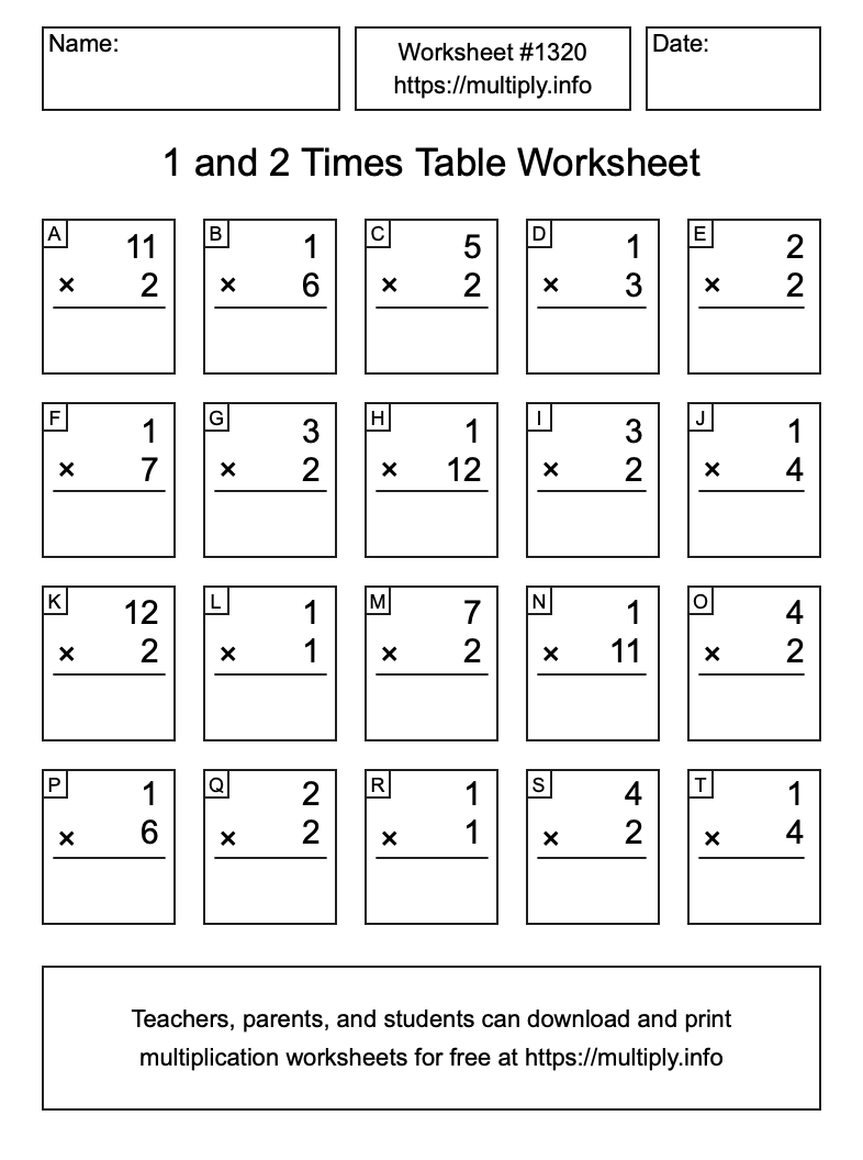 Here is the 1 and 2 Times Table Worksheet #1320. This worksheet contains problems related to the multiplication table of 1 and the multiplication table of 2. Print and/or save the worksheet using the buttons below the image. You can also drag or right-click on the image to download it to your device.