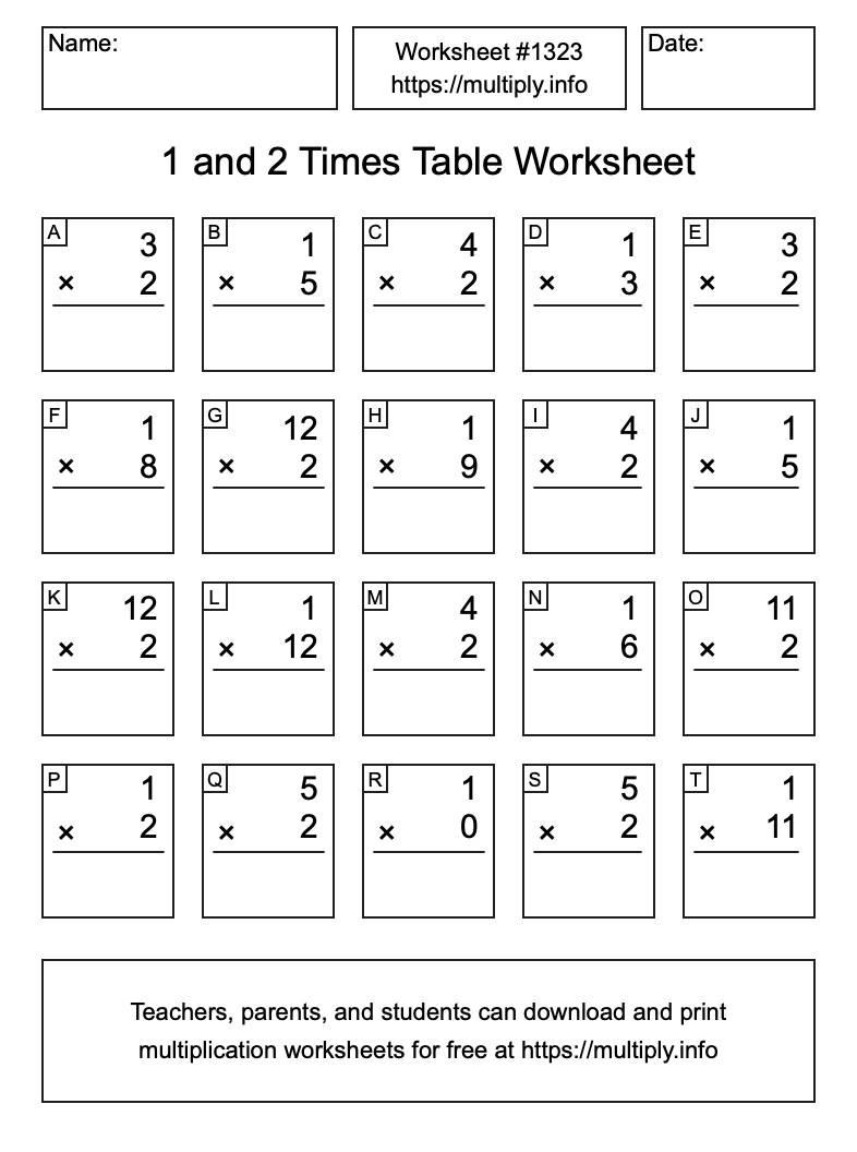 Here is the 1 and 2 Times Table Worksheet #1323. This worksheet contains problems related to the multiplication table of 1 and the multiplication table of 2. Print and/or save the worksheet using the buttons below the image. You can also drag or right-click on the image to download it to your device.