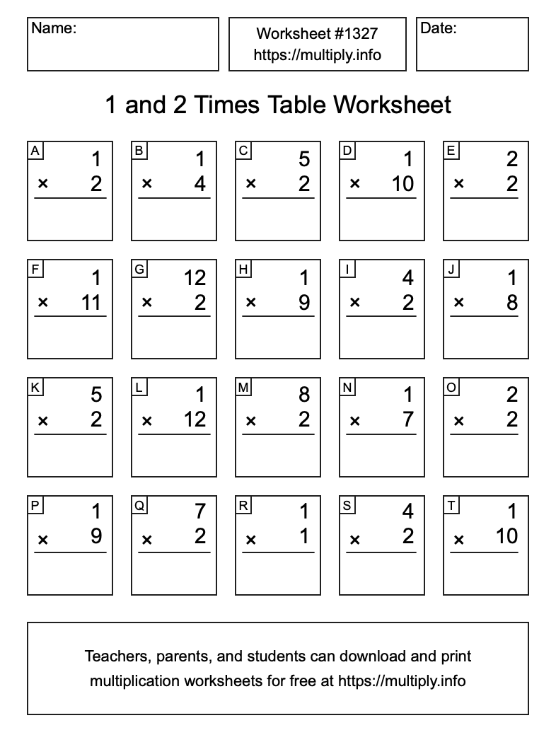 Here is the 1 and 2 Times Table Worksheet #1327. This worksheet contains problems related to the multiplication table of 1 and the multiplication table of 2. Print and/or save the worksheet using the buttons below the image. You can also drag or right-click on the image to download it to your device.