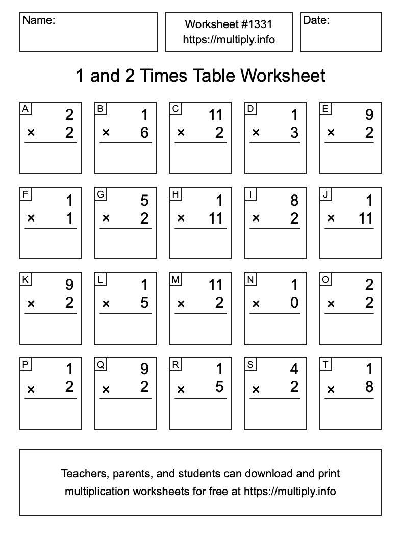 Here is the 1 and 2 Times Table Worksheet #1331. This worksheet contains problems related to the multiplication table of 1 and the multiplication table of 2. Print and/or save the worksheet using the buttons below the image. You can also drag or right-click on the image to download it to your device.