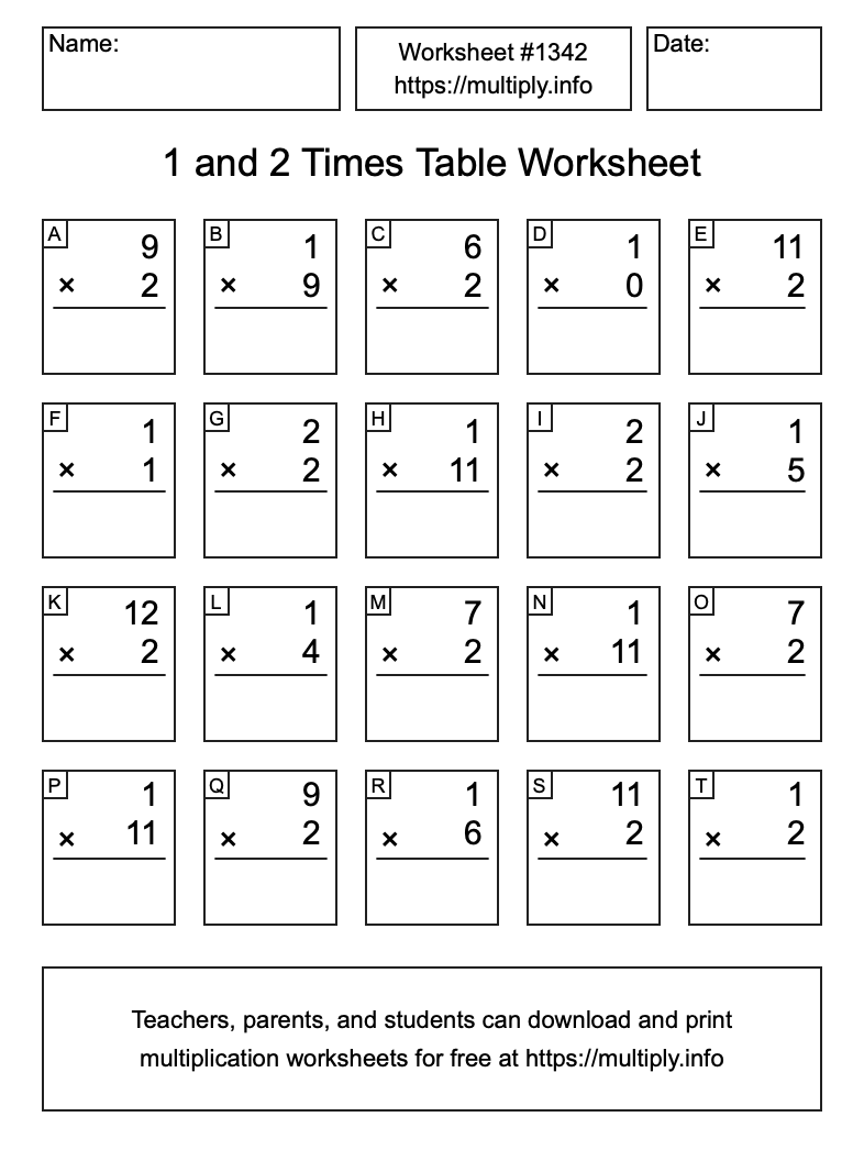 Here is the 1 and 2 Times Table Worksheet #1342. This worksheet contains problems related to the multiplication table of 1 and the multiplication table of 2. Print and/or save the worksheet using the buttons below the image. You can also drag or right-click on the image to download it to your device.