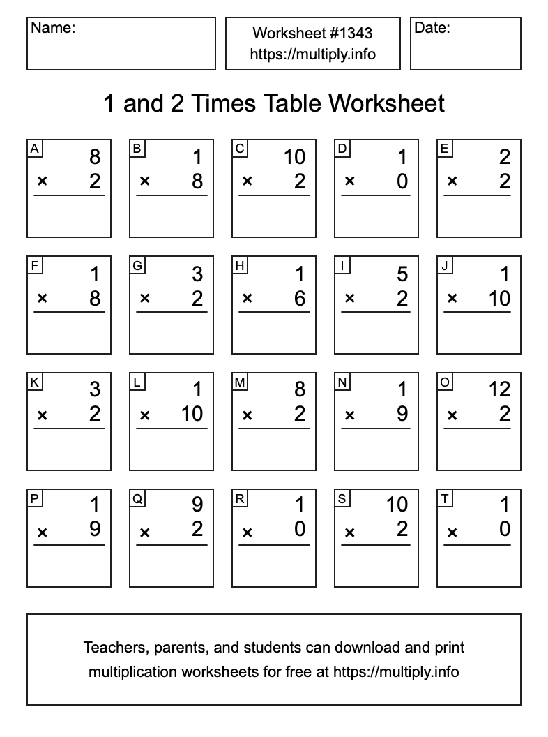 Here is the 1 and 2 Times Table Worksheet #1343. This worksheet contains problems related to the multiplication table of 1 and the multiplication table of 2. Print and/or save the worksheet using the buttons below the image. You can also drag or right-click on the image to download it to your device.