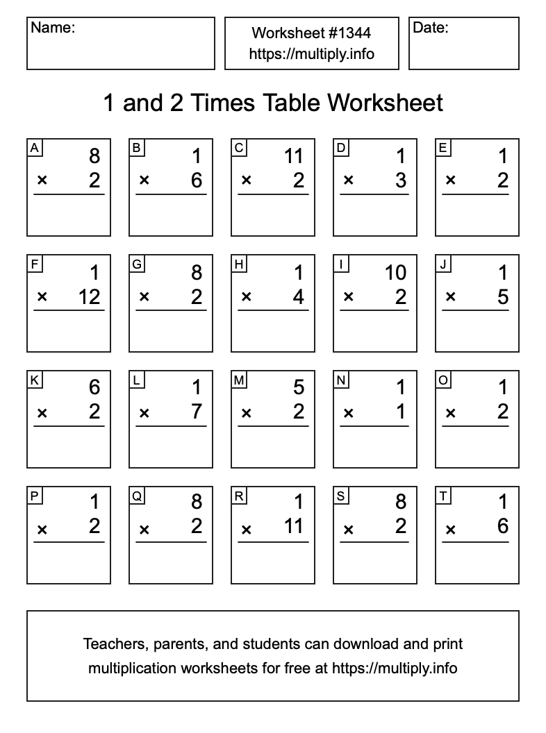 Here is the 1 and 2 Times Table Worksheet #1344. This worksheet contains problems related to the multiplication table of 1 and the multiplication table of 2. Print and/or save the worksheet using the buttons below the image. You can also drag or right-click on the image to download it to your device.