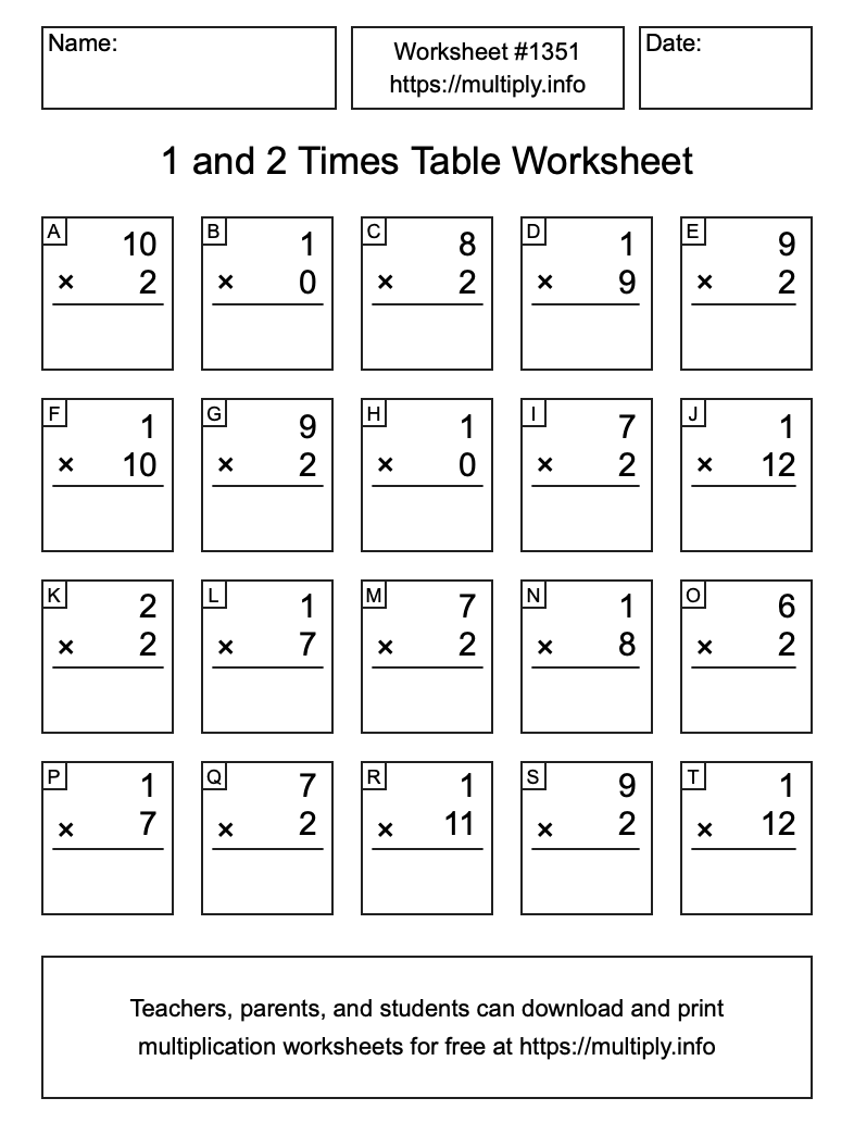 Here is the 1 and 2 Times Table Worksheet #1351. This worksheet contains problems related to the multiplication table of 1 and the multiplication table of 2. Print and/or save the worksheet using the buttons below the image. You can also drag or right-click on the image to download it to your device.