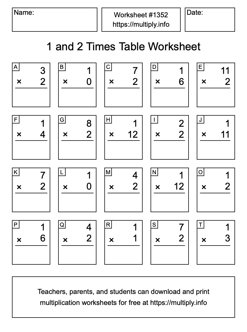 Here is the 1 and 2 Times Table Worksheet #1352. This worksheet contains problems related to the multiplication table of 1 and the multiplication table of 2. Print and/or save the worksheet using the buttons below the image. You can also drag or right-click on the image to download it to your device.