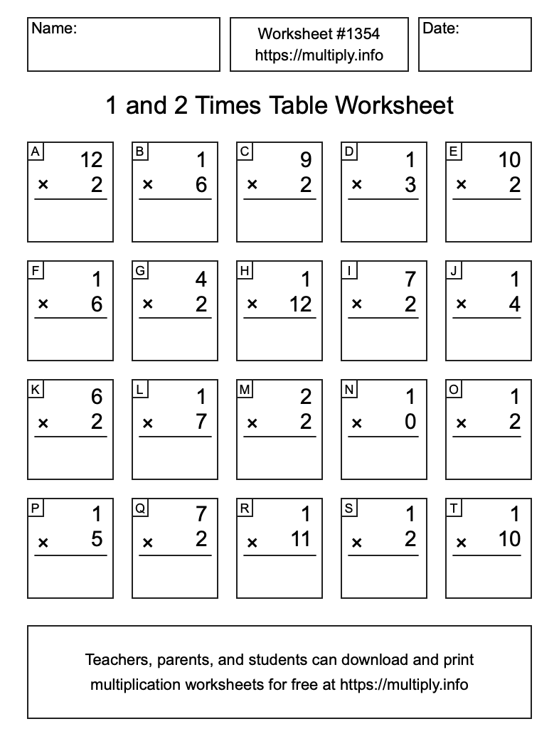Here is the 1 and 2 Times Table Worksheet #1354. This worksheet contains problems related to the multiplication table of 1 and the multiplication table of 2. Print and/or save the worksheet using the buttons below the image. You can also drag or right-click on the image to download it to your device.