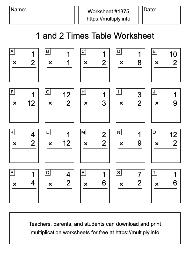 Here is the 1 and 2 Times Table Worksheet #1375. This worksheet contains problems related to the multiplication table of 1 and the multiplication table of 2. Print and/or save the worksheet using the buttons below the image. You can also drag or right-click on the image to download it to your device.