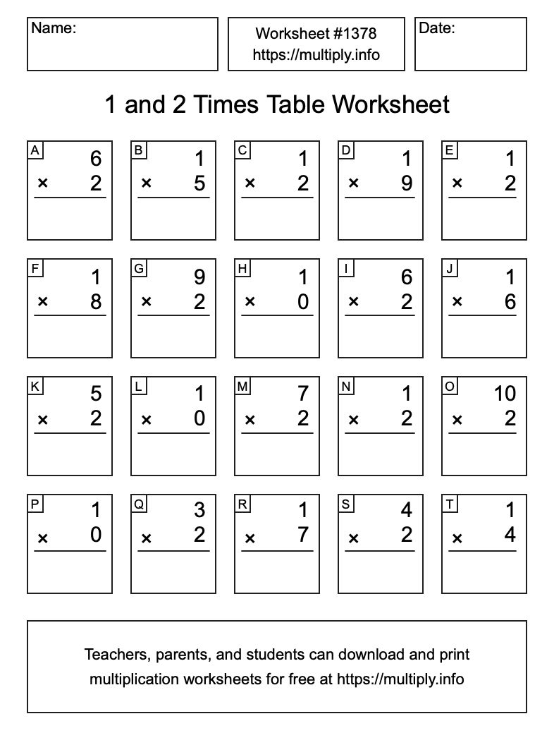 Here is the 1 and 2 Times Table Worksheet #1378. This worksheet contains problems related to the multiplication table of 1 and the multiplication table of 2. Print and/or save the worksheet using the buttons below the image. You can also drag or right-click on the image to download it to your device.
