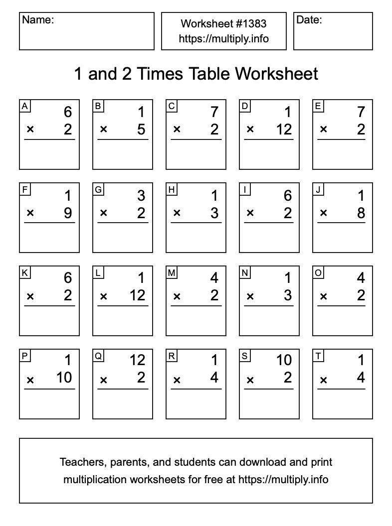 Here is the 1 and 2 Times Table Worksheet #1383. This worksheet contains problems related to the multiplication table of 1 and the multiplication table of 2. Print and/or save the worksheet using the buttons below the image. You can also drag or right-click on the image to download it to your device.