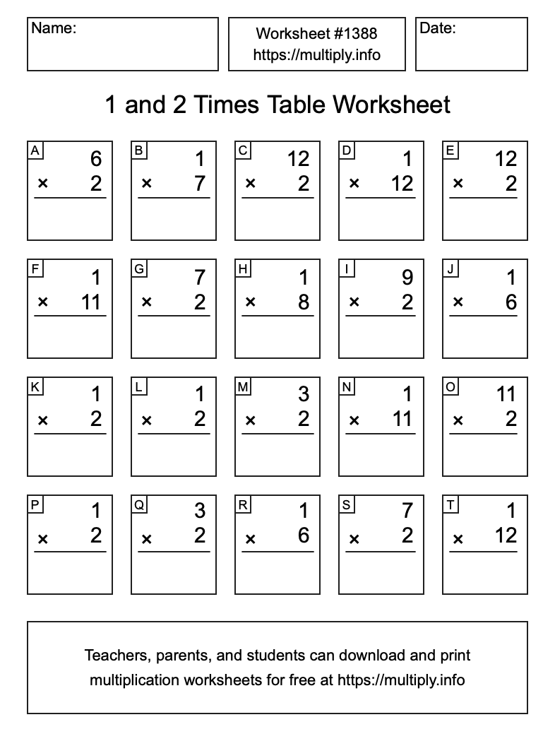 Here is the 1 and 2 Times Table Worksheet #1388. This worksheet contains problems related to the multiplication table of 1 and the multiplication table of 2. Print and/or save the worksheet using the buttons below the image. You can also drag or right-click on the image to download it to your device.