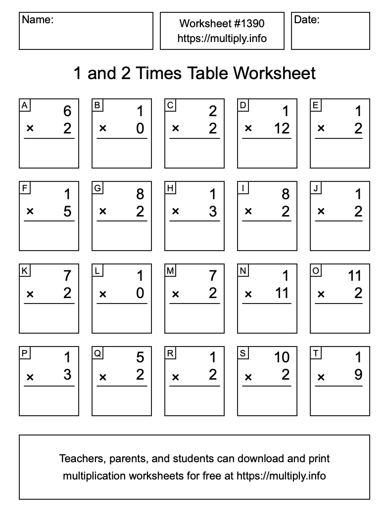 Here is the 1 and 2 Times Table Worksheet #1390. This worksheet contains problems related to the multiplication table of 1 and the multiplication table of 2. Print and/or save the worksheet using the buttons below the image. You can also drag or right-click on the image to download it to your device.