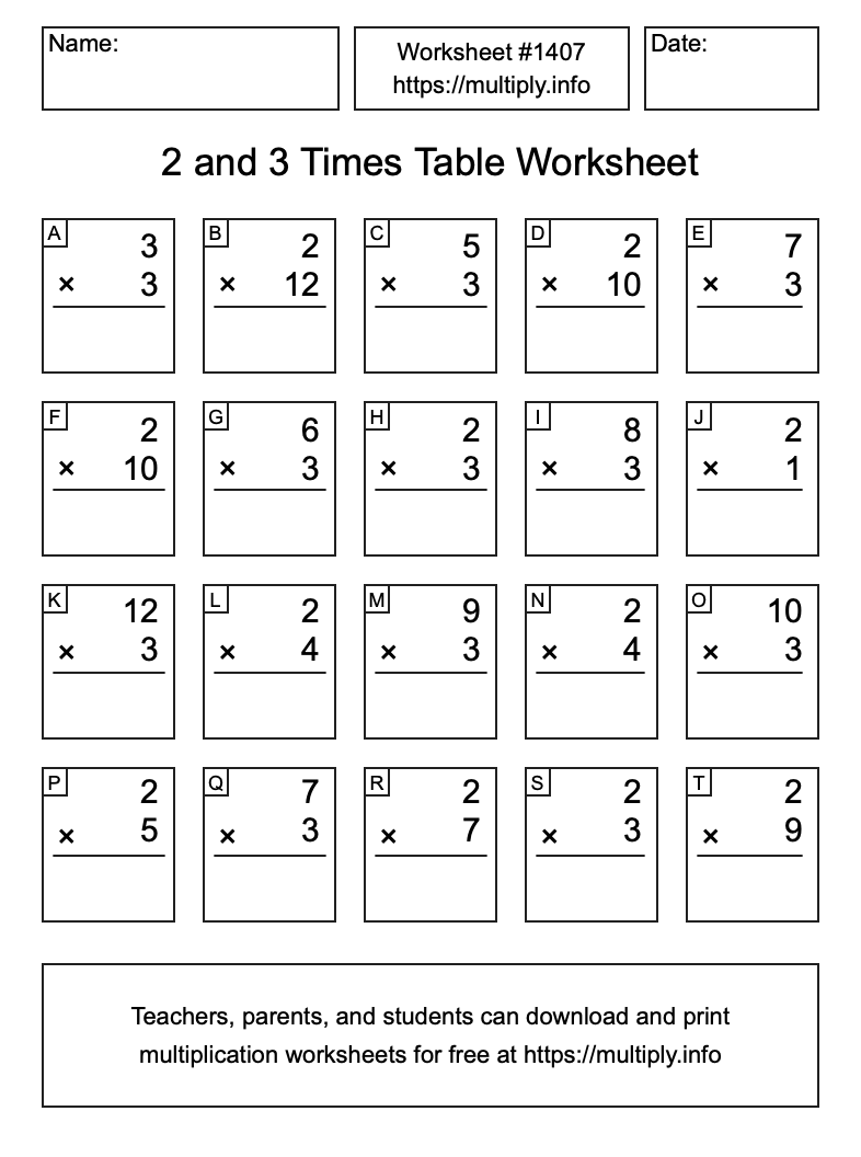 Here is the 2 and 3 Times Table Worksheet #1407. This worksheet contains problems related to the multiplication table of 2 and the multiplication table of 3. Print and/or save the worksheet using the buttons below the image. You can also drag or right-click on the image to download it to your device.