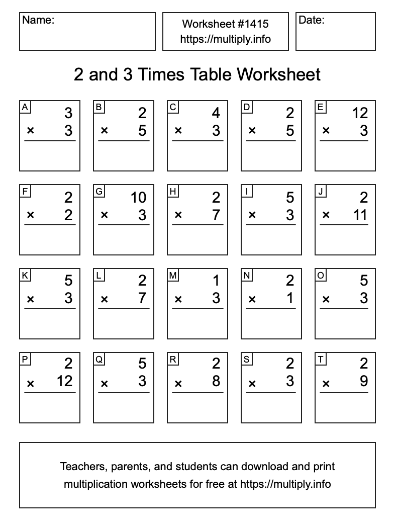 Here is the 2 and 3 Times Table Worksheet #1415. This worksheet contains problems related to the multiplication table of 2 and the multiplication table of 3. Print and/or save the worksheet using the buttons below the image. You can also drag or right-click on the image to download it to your device.