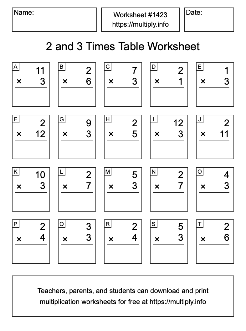 Here is the 2 and 3 Times Table Worksheet #1423. This worksheet contains problems related to the multiplication table of 2 and the multiplication table of 3. Print and/or save the worksheet using the buttons below the image. You can also drag or right-click on the image to download it to your device.