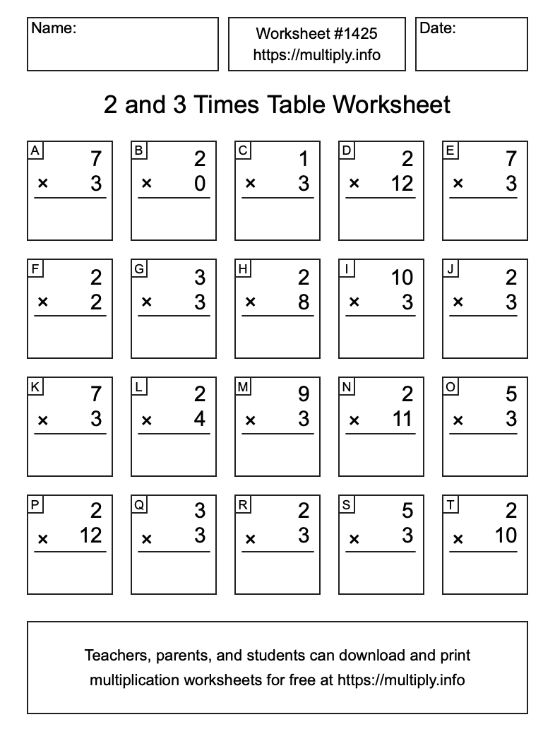 Here is the 2 and 3 Times Table Worksheet #1425. This worksheet contains problems related to the multiplication table of 2 and the multiplication table of 3. Print and/or save the worksheet using the buttons below the image. You can also drag or right-click on the image to download it to your device.
