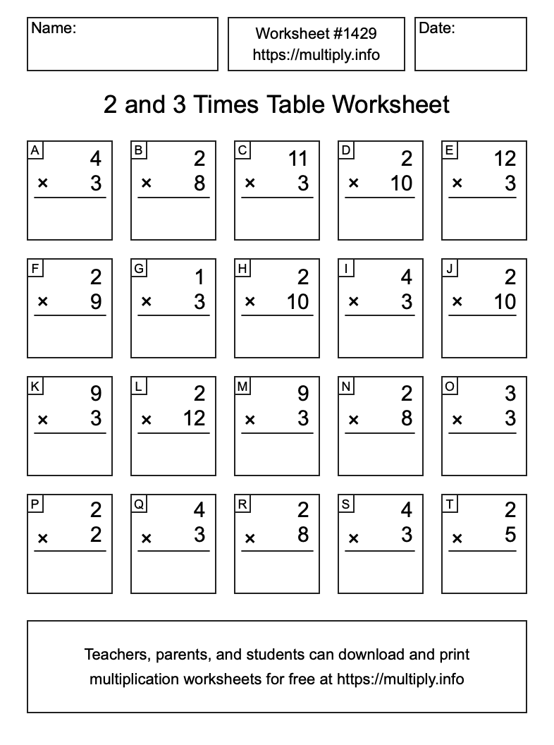 Here is the 2 and 3 Times Table Worksheet #1429. This worksheet contains problems related to the multiplication table of 2 and the multiplication table of 3. Print and/or save the worksheet using the buttons below the image. You can also drag or right-click on the image to download it to your device.