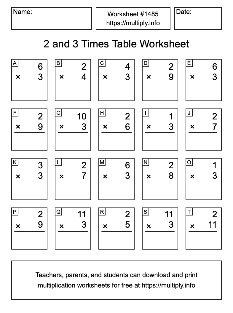Here is the 2 and 3 Times Table Worksheet #1485. This worksheet contains problems related to the multiplication table of 2 and the multiplication table of 3. Print and/or save the worksheet using the buttons below the image. You can also drag or right-click on the image to download it to your device.