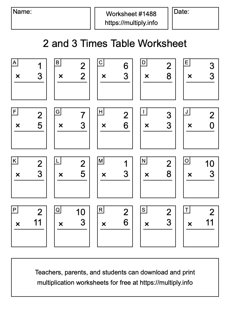 Here is the 2 and 3 Times Table Worksheet #1488. This worksheet contains problems related to the multiplication table of 2 and the multiplication table of 3. Print and/or save the worksheet using the buttons below the image. You can also drag or right-click on the image to download it to your device.