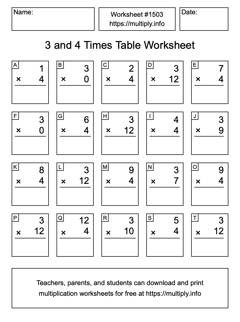 Here is the 3 and 4 Times Table Worksheet #1503. This worksheet contains problems related to the multiplication table of 3 and the multiplication table of 4. Print and/or save the worksheet using the buttons below the image. You can also drag or right-click on the image to download it to your device.