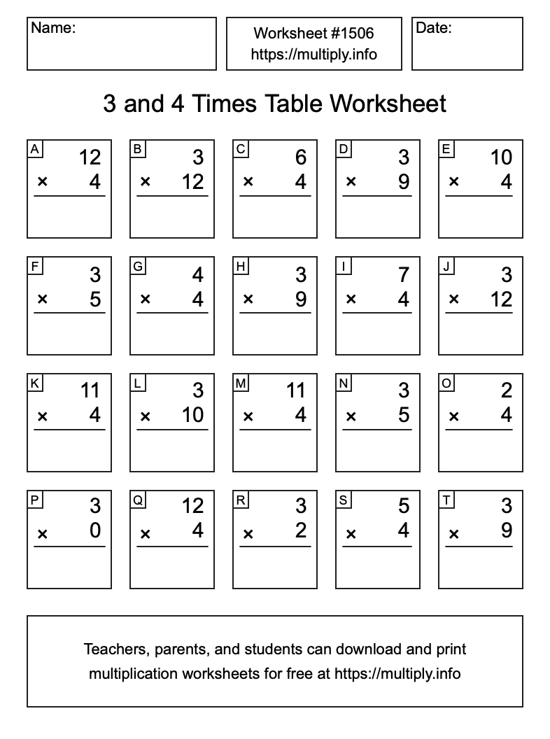 Here is the 3 and 4 Times Table Worksheet #1506. This worksheet contains problems related to the multiplication table of 3 and the multiplication table of 4. Print and/or save the worksheet using the buttons below the image. You can also drag or right-click on the image to download it to your device.