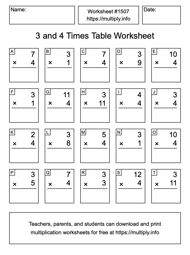 Here is the 3 and 4 Times Table Worksheet #1507. This worksheet contains problems related to the multiplication table of 3 and the multiplication table of 4. Print and/or save the worksheet using the buttons below the image. You can also drag or right-click on the image to download it to your device.