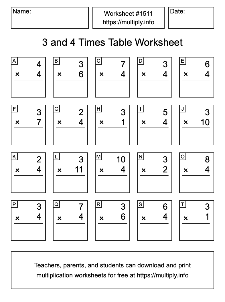 3 and 4 Times Table Worksheet #1512
