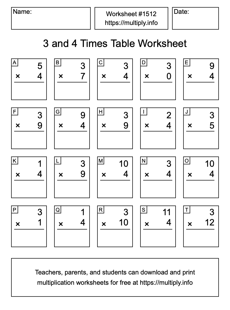 Here is the 3 and 4 Times Table Worksheet #1512. This worksheet contains problems related to the multiplication table of 3 and the multiplication table of 4. Print and/or save the worksheet using the buttons below the image. You can also drag or right-click on the image to download it to your device.