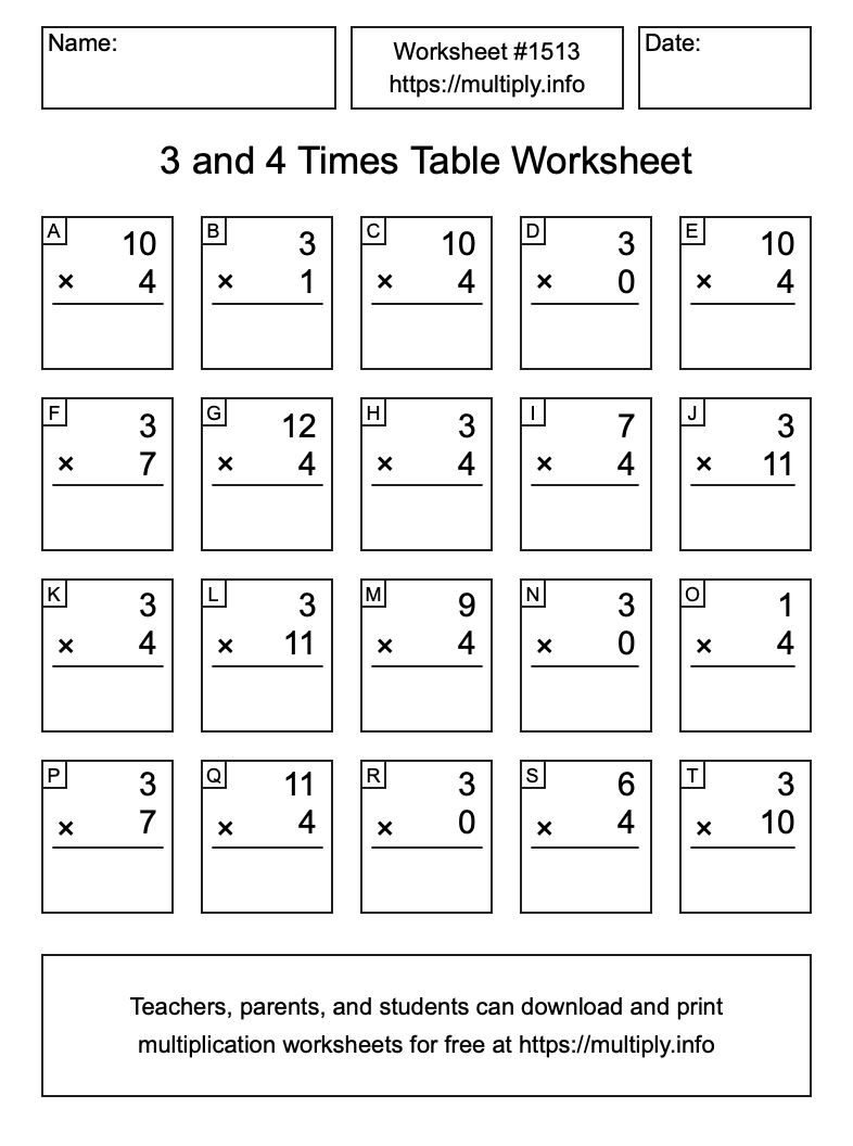 Here is the 3 and 4 Times Table Worksheet #1513. This worksheet contains problems related to the multiplication table of 3 and the multiplication table of 4. Print and/or save the worksheet using the buttons below the image. You can also drag or right-click on the image to download it to your device.