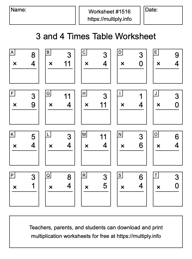 Here is the 3 and 4 Times Table Worksheet #1516. This worksheet contains problems related to the multiplication table of 3 and the multiplication table of 4. Print and/or save the worksheet using the buttons below the image. You can also drag or right-click on the image to download it to your device.