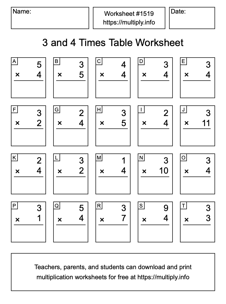 Here is the 3 and 4 Times Table Worksheet #1519. This worksheet contains problems related to the multiplication table of 3 and the multiplication table of 4. Print and/or save the worksheet using the buttons below the image. You can also drag or right-click on the image to download it to your device.