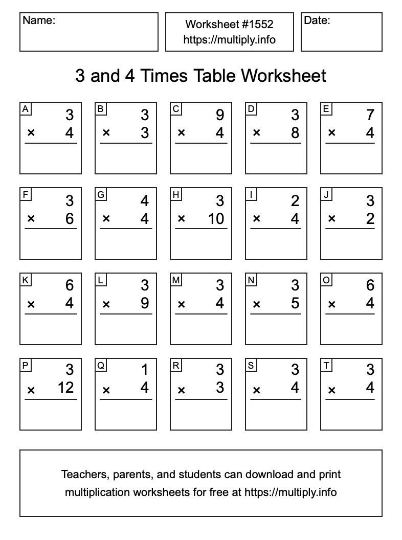 Here is the 3 and 4 Times Table Worksheet #1552. This worksheet contains problems related to the multiplication table of 3 and the multiplication table of 4. Print and/or save the worksheet using the buttons below the image. You can also drag or right-click on the image to download it to your device.