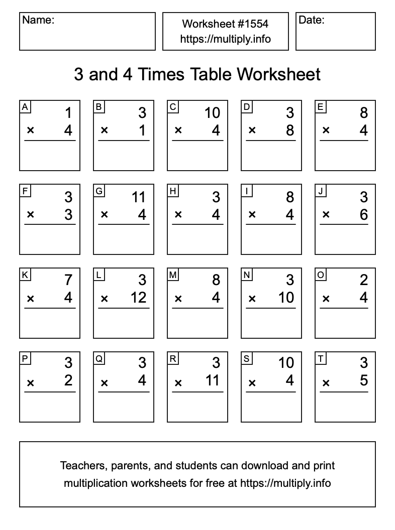 3 and 4 Times Table Worksheet #1555