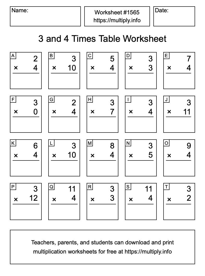 Here is the 3 and 4 Times Table Worksheet #1565. This worksheet contains problems related to the multiplication table of 3 and the multiplication table of 4. Print and/or save the worksheet using the buttons below the image. You can also drag or right-click on the image to download it to your device.