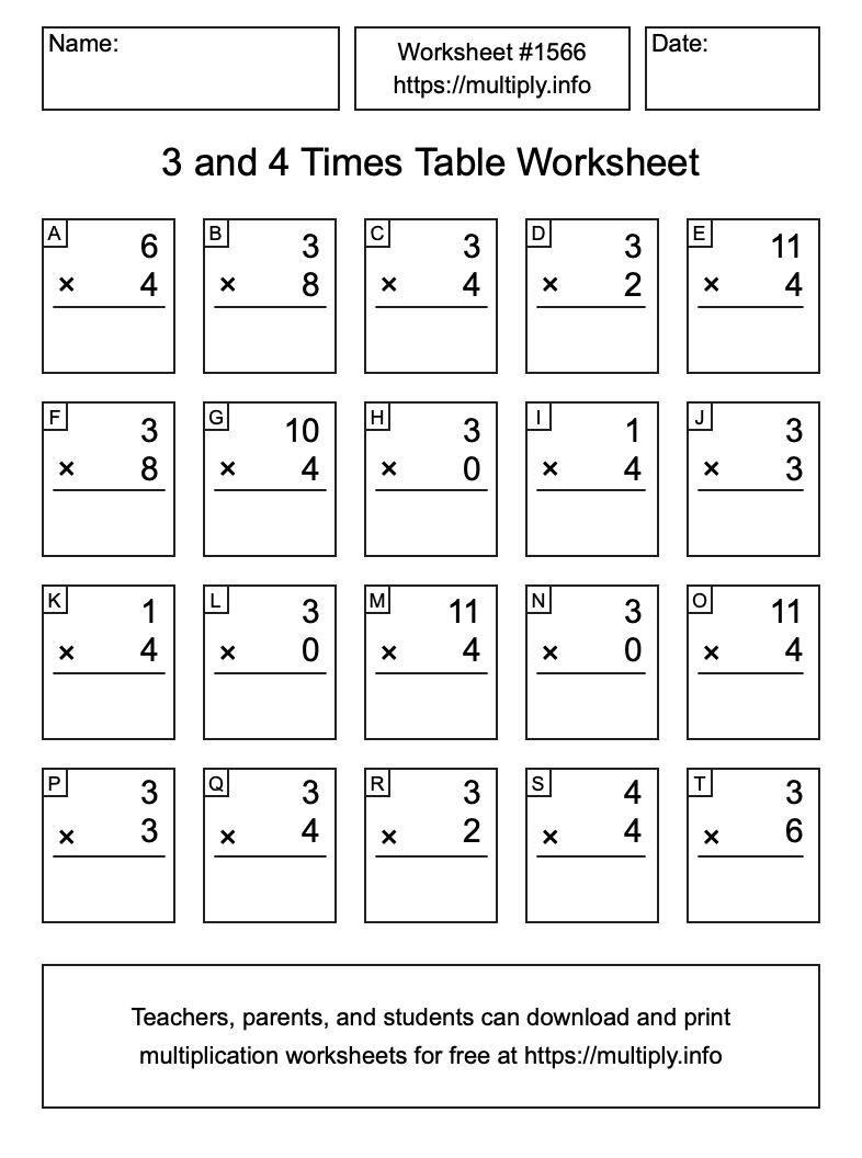 Here is the 3 and 4 Times Table Worksheet #1566. This worksheet contains problems related to the multiplication table of 3 and the multiplication table of 4. Print and/or save the worksheet using the buttons below the image. You can also drag or right-click on the image to download it to your device.
