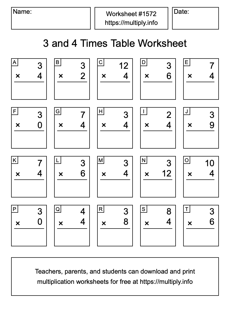 Here is the 3 and 4 Times Table Worksheet #1572. This worksheet contains problems related to the multiplication table of 3 and the multiplication table of 4. Print and/or save the worksheet using the buttons below the image. You can also drag or right-click on the image to download it to your device.