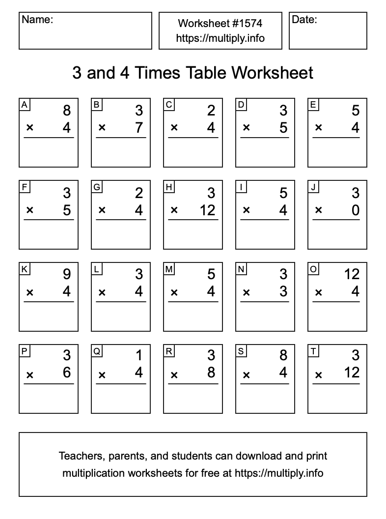 Here is the 3 and 4 Times Table Worksheet #1574. This worksheet contains problems related to the multiplication table of 3 and the multiplication table of 4. Print and/or save the worksheet using the buttons below the image. You can also drag or right-click on the image to download it to your device.