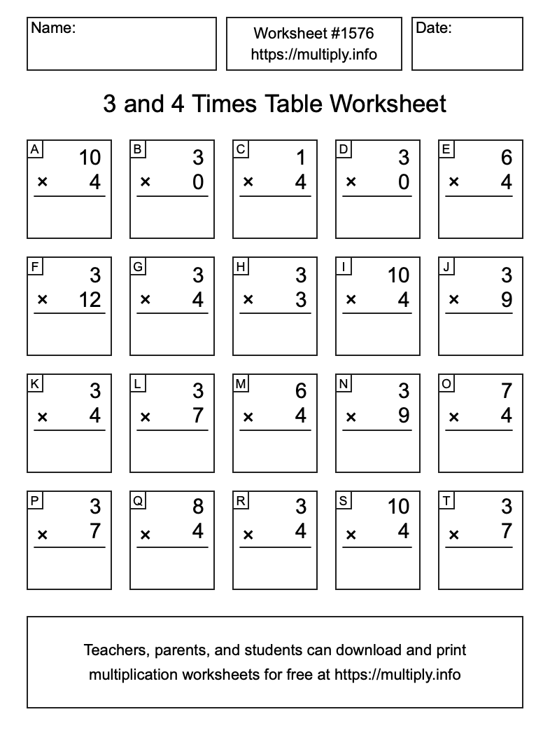 Here is the 3 and 4 Times Table Worksheet #1576. This worksheet contains problems related to the multiplication table of 3 and the multiplication table of 4. Print and/or save the worksheet using the buttons below the image. You can also drag or right-click on the image to download it to your device.