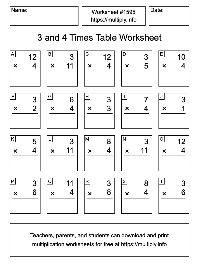 Here is the 3 and 4 Times Table Worksheet #1595. This worksheet contains problems related to the multiplication table of 3 and the multiplication table of 4. Print and/or save the worksheet using the buttons below the image. You can also drag or right-click on the image to download it to your device.