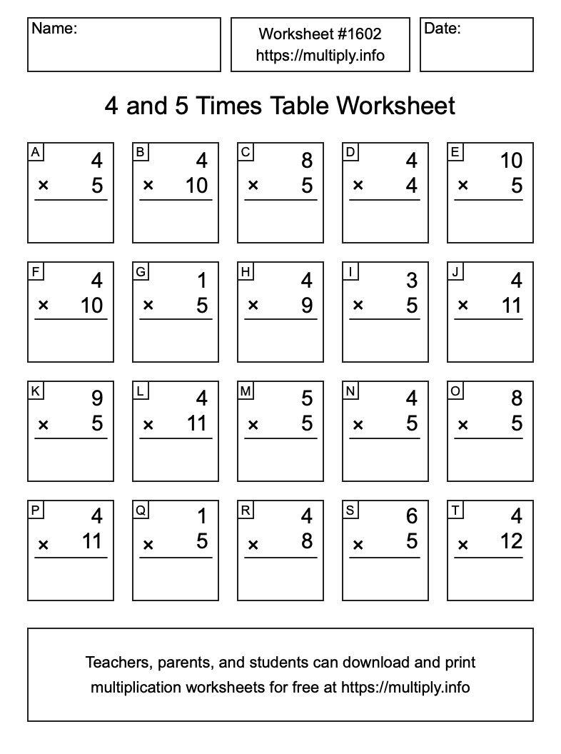 Here is the 4 and 5 Times Table Worksheet #1602. This worksheet contains problems related to the multiplication table of 4 and the multiplication table of 5. Print and/or save the worksheet using the buttons below the image. You can also drag or right-click on the image to download it to your device.