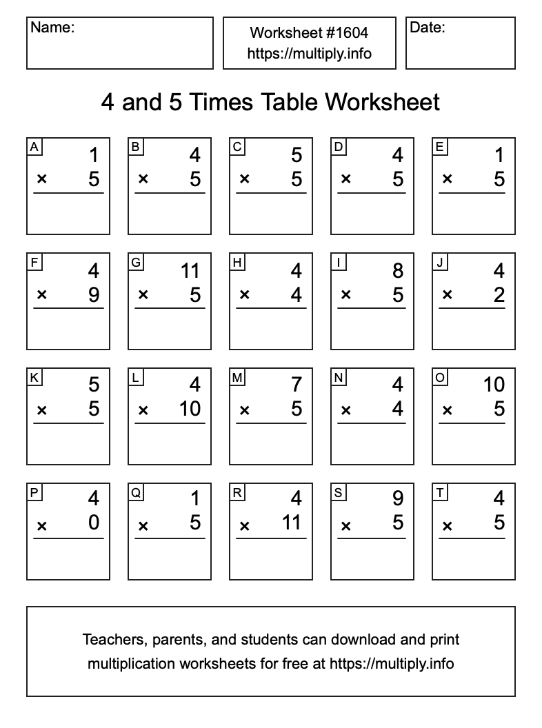 Here is the 4 and 5 Times Table Worksheet #1604. This worksheet contains problems related to the multiplication table of 4 and the multiplication table of 5. Print and/or save the worksheet using the buttons below the image. You can also drag or right-click on the image to download it to your device.