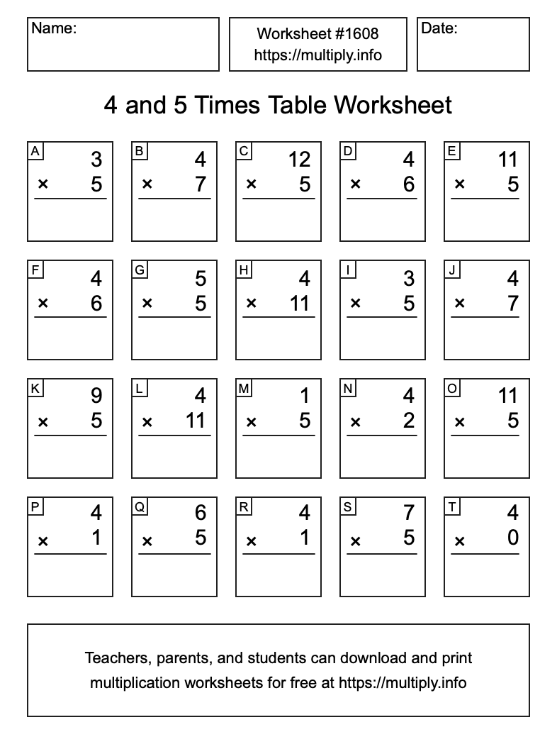 Here is the 4 and 5 Times Table Worksheet #1608. This worksheet contains problems related to the multiplication table of 4 and the multiplication table of 5. Print and/or save the worksheet using the buttons below the image. You can also drag or right-click on the image to download it to your device.