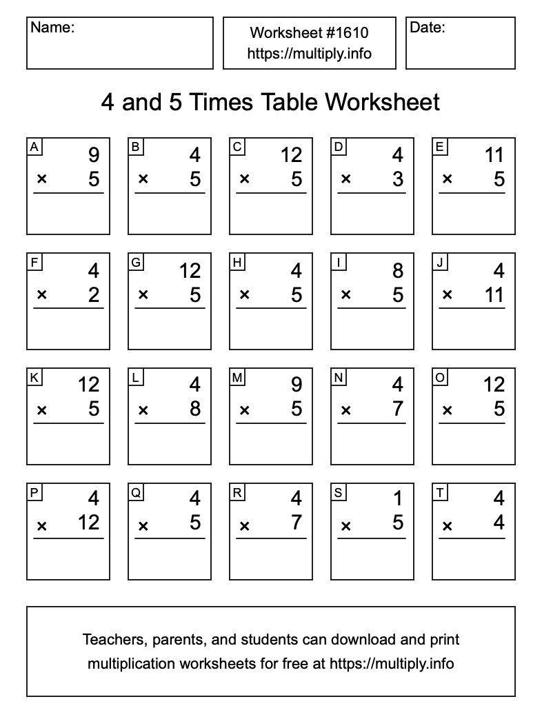 Here is the 4 and 5 Times Table Worksheet #1610. This worksheet contains problems related to the multiplication table of 4 and the multiplication table of 5. Print and/or save the worksheet using the buttons below the image. You can also drag or right-click on the image to download it to your device.