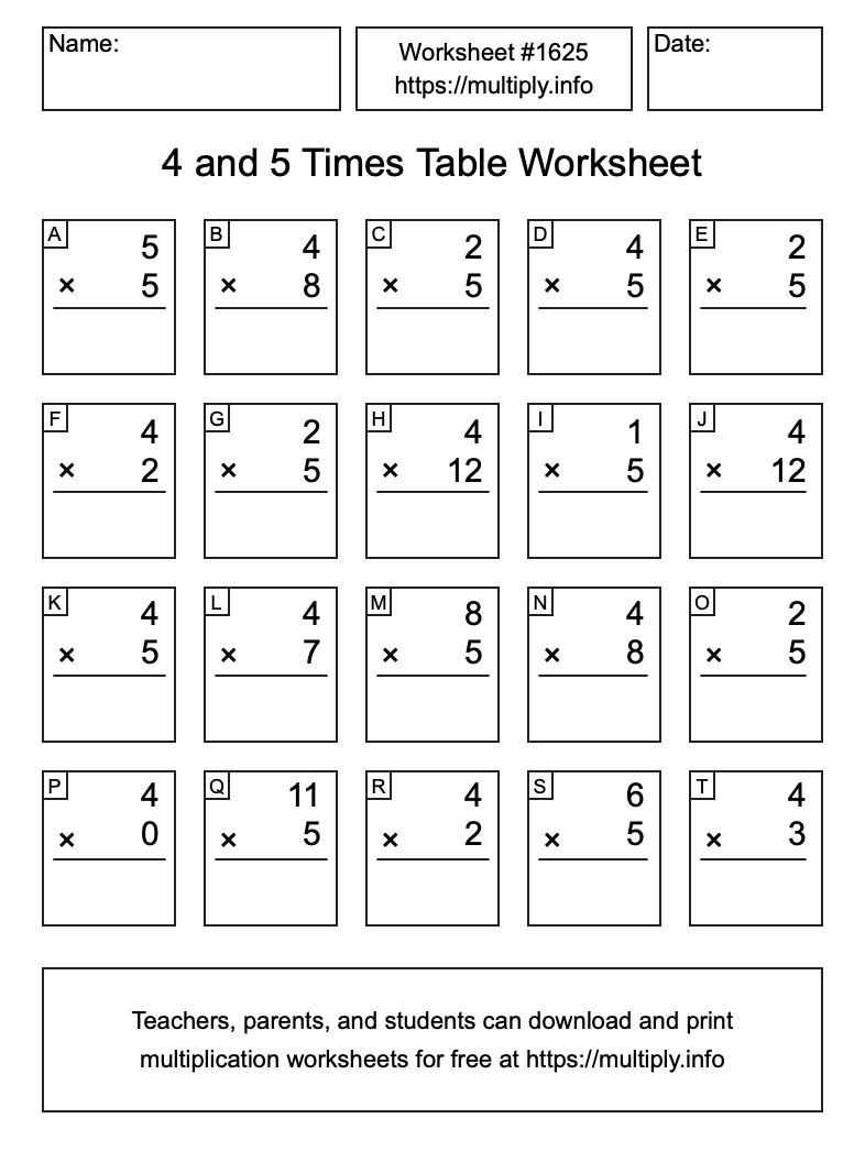 Here is the 4 and 5 Times Table Worksheet #1625. This worksheet contains problems related to the multiplication table of 4 and the multiplication table of 5. Print and/or save the worksheet using the buttons below the image. You can also drag or right-click on the image to download it to your device.