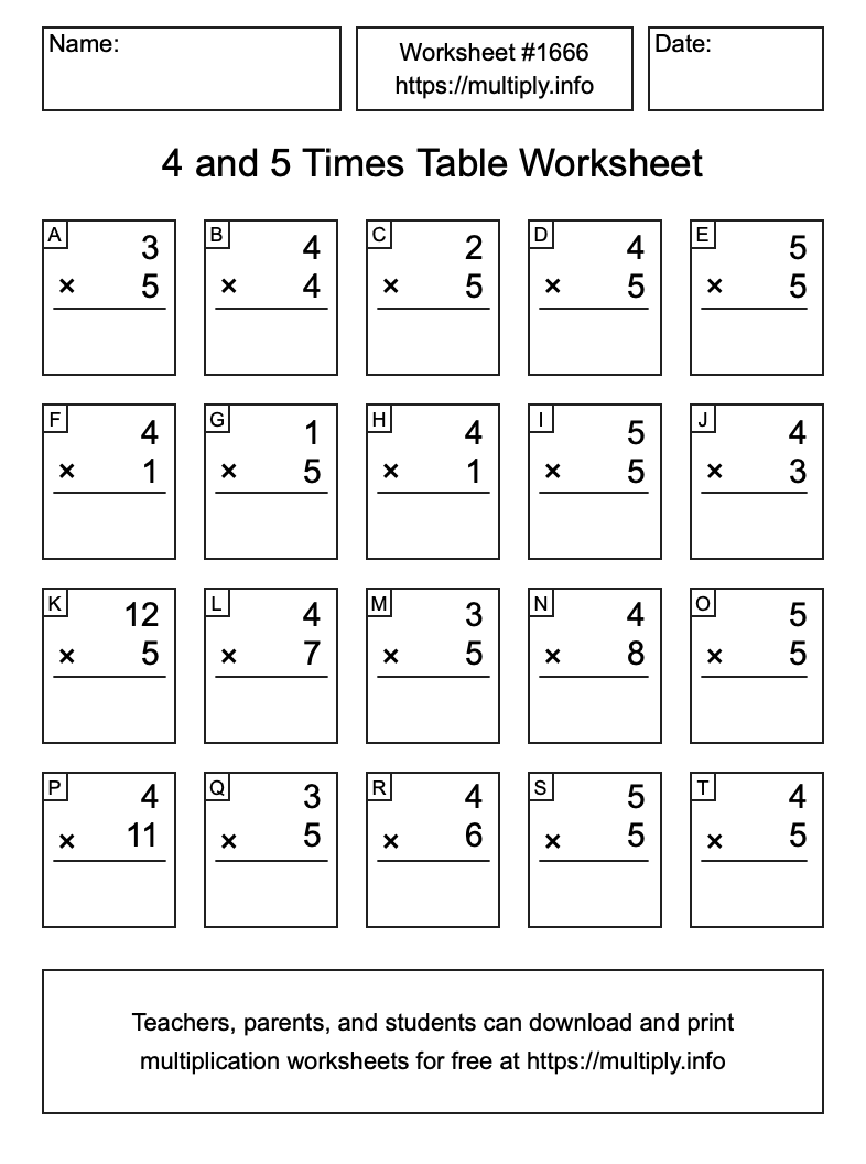 Here is the 4 and 5 Times Table Worksheet #1666. This worksheet contains problems related to the multiplication table of 4 and the multiplication table of 5. Print and/or save the worksheet using the buttons below the image. You can also drag or right-click on the image to download it to your device.