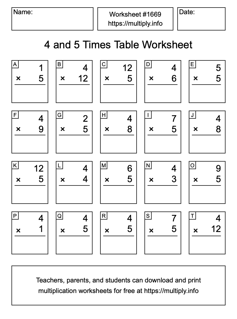 Here is the 4 and 5 Times Table Worksheet #1669. This worksheet contains problems related to the multiplication table of 4 and the multiplication table of 5. Print and/or save the worksheet using the buttons below the image. You can also drag or right-click on the image to download it to your device.