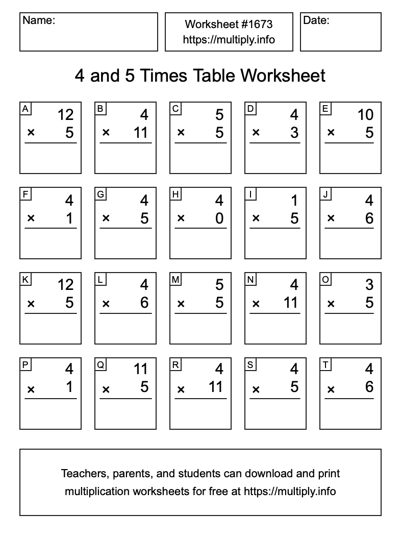 Here is the 4 and 5 Times Table Worksheet #1673. This worksheet contains problems related to the multiplication table of 4 and the multiplication table of 5. Print and/or save the worksheet using the buttons below the image. You can also drag or right-click on the image to download it to your device.