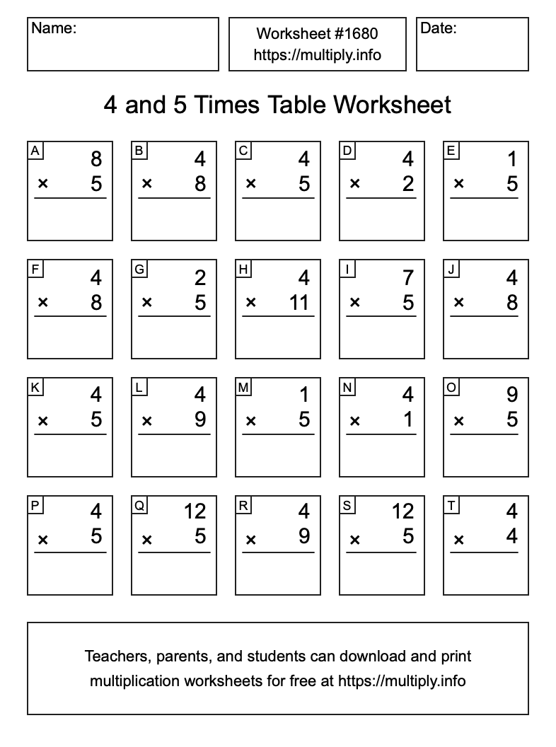 Here is the 4 and 5 Times Table Worksheet #1680. This worksheet contains problems related to the multiplication table of 4 and the multiplication table of 5. Print and/or save the worksheet using the buttons below the image. You can also drag or right-click on the image to download it to your device.