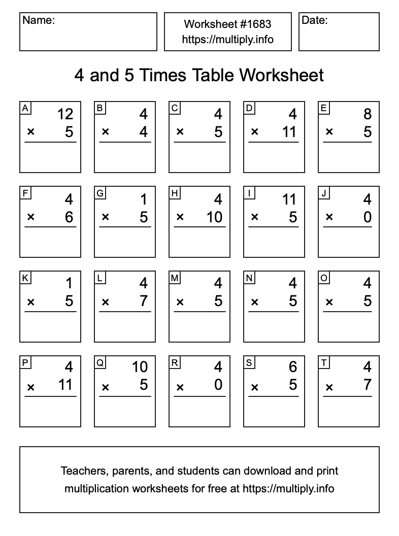 Here is the 4 and 5 Times Table Worksheet #1683. This worksheet contains problems related to the multiplication table of 4 and the multiplication table of 5. Print and/or save the worksheet using the buttons below the image. You can also drag or right-click on the image to download it to your device.