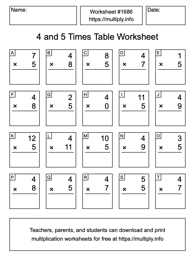 Here is the 4 and 5 Times Table Worksheet #1686. This worksheet contains problems related to the multiplication table of 4 and the multiplication table of 5. Print and/or save the worksheet using the buttons below the image. You can also drag or right-click on the image to download it to your device.